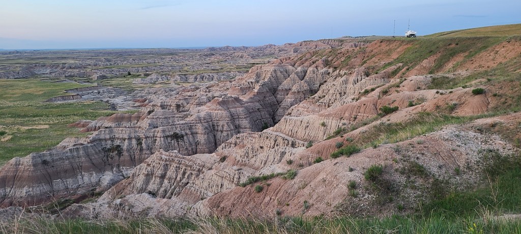 Our next stop was the Bad Lands of South Dakota. We exited the interstate highway at Wall, SD and headed south a few miles. Nomad’s Overlook is located in the Buffalo Gap National Grasslands and sits right along the boarder of Badlands National Park. The overlook is a popular boondocking location. As our youngest grandchild would say, “It is epic.” We were able to park right on the rim of the Badlands. Just feet from out front door was a drop off of several hundred feet. It was a beautiful place to camp! As we were sitting up a Big Horn Sheep Ram walked to within fifty feet of our campsite. Unfortunately, since we were setting up and his presence was such a surprise no one got a picture of the majestic animal.
