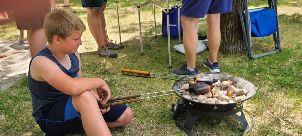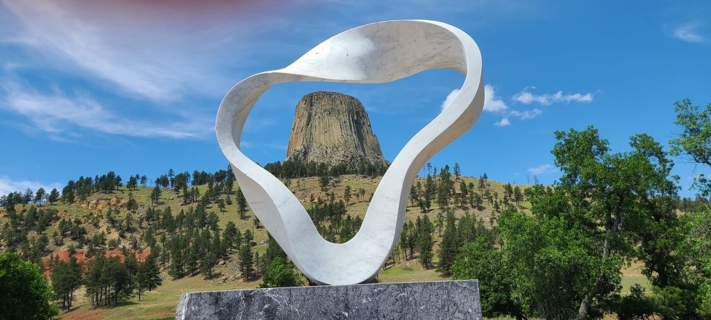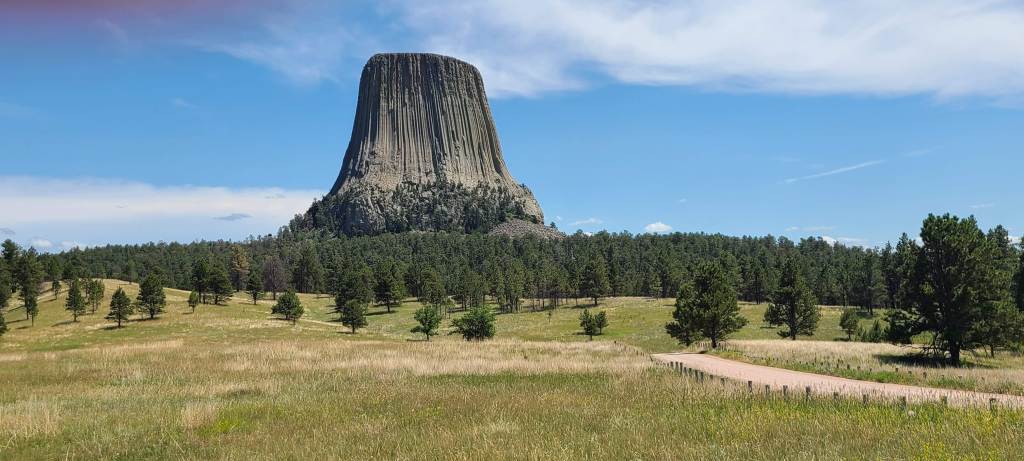 My sister had encouraged us to go to Devil’s Tower, Wyoming. So, we took a day and headed over there. We had such a good time there and were so glad we had gone. It is an amazing place. Shear rock climbing up out of the prairie so large and so tall it can be seen for miles. The plan for the day was to have a picnic lunch with sandwiches cooked over the fire. We took the propane fire pit and pie irons and had quite the feast. Upon arriving at the picnic area and laying claim to our spot, I spied a large snake just a few feet away. Turns out it was a five to six-foot bull snake. The snake proceeded to climb a nearby tree. (Think about that the next time you are strolling through the woods!) The ranger said the snake was looking for bird nests to rob. We loved out time at Devil’s Tower. Mary and I were so impressed we came home and watched Close Encounters of The Third Kind.