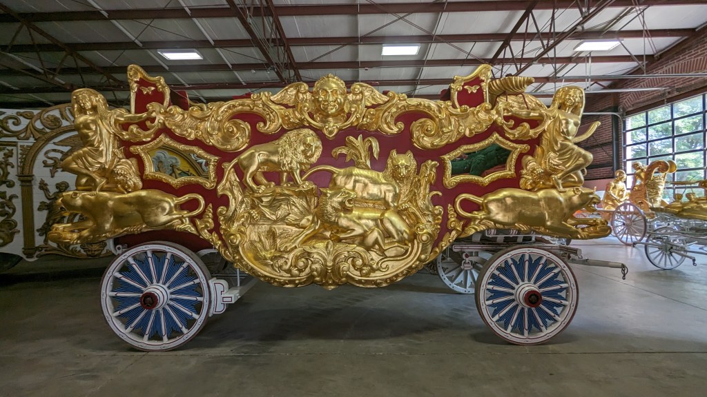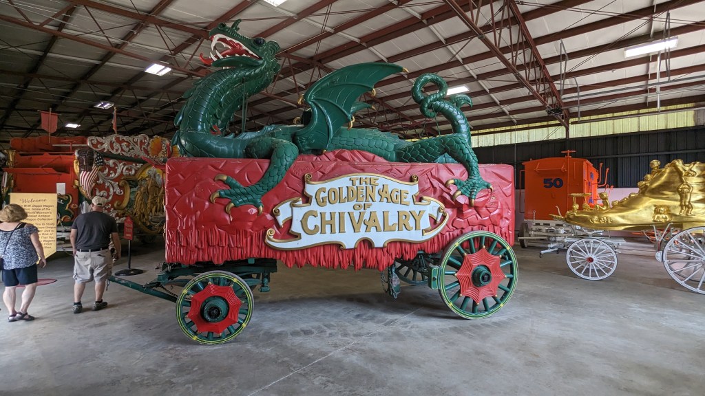 When you enter Circus World, you come in through the museum. There are numerous displays giving information about the circus industry and history. The largest collection of circus advertising in the world is housed here. After taking in the displays, you can exit out the rear and cross the bridge over the Baraboo River onto the Circus Grounds. The Deppe Wagon Pavilion displays the world’s largest collection of circus wagons. These wagons range from wagons small enough to be pulled by a pony to massive wagons which would require a large team of horses. Each one is unique and beautifully ornate. If you are there by 10:00 AM, you can receive a guided tour of this building and learn firsthand about the wagons. Next door is the C.P. Fox Wagon Restoration Center. This building contains a few more wagons, a large miniature circus display, a working circus calliope, and gives you a window into the workshop where the historic circus wagons are restored.